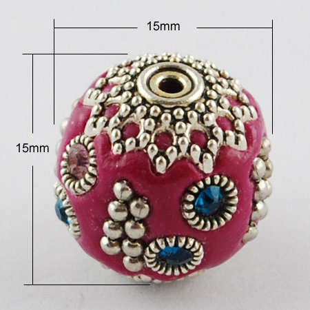 5 x Handmade Indonesian Beads, Tibetan Silver & Polymer Clay, Red, Alloy Core, Diameter approx 15mm, drilled hole: 2mm